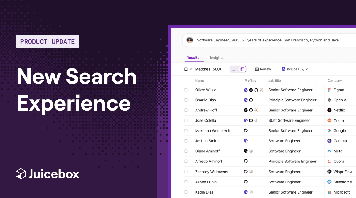 Juicebox is built for recruiters. If you are searching for hard-to-find talent, Juicebox is a fit for you. We work with companies ranging from Fortune 500 to boutique recruiting agencies — and hopefully, you too.
