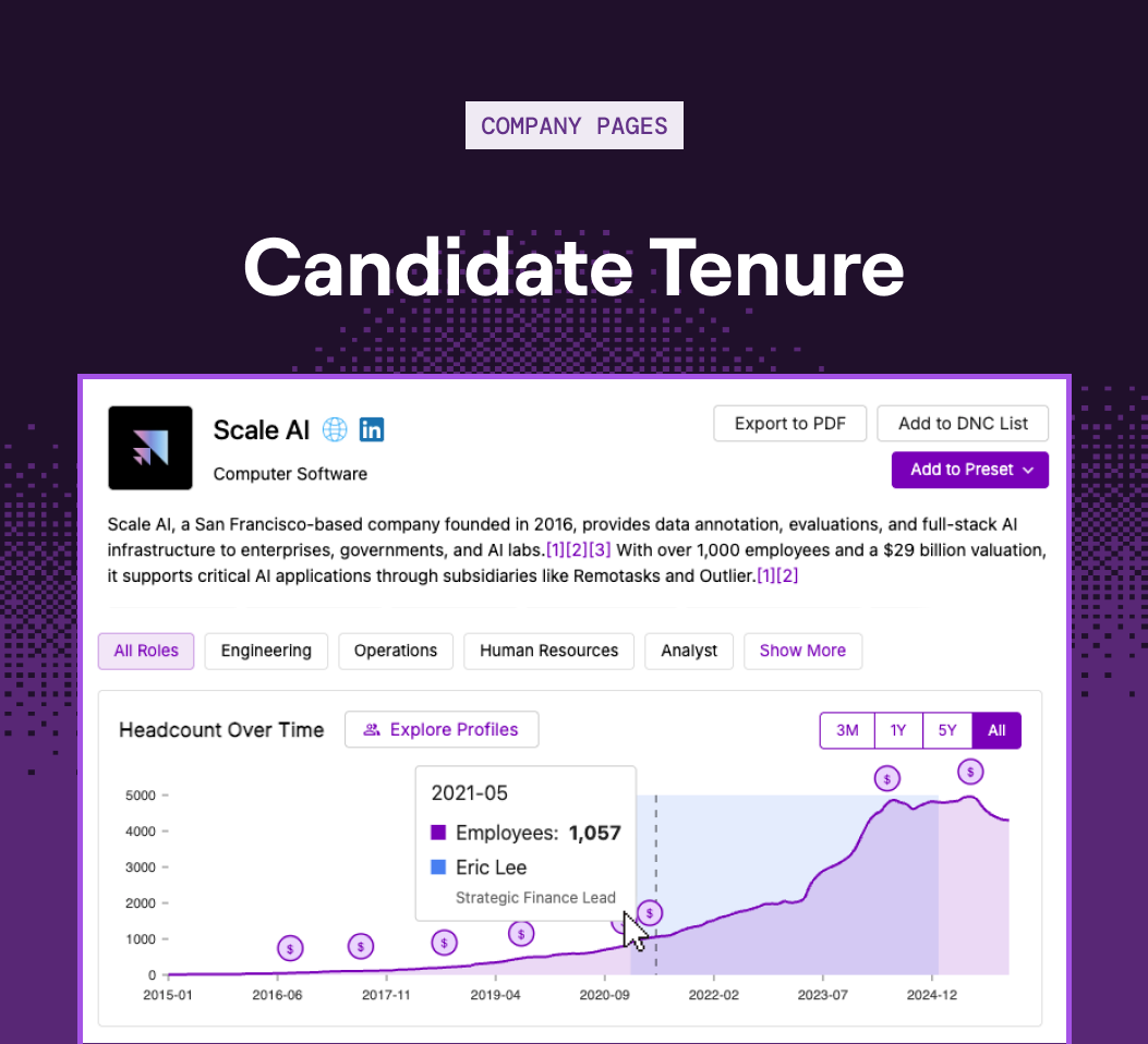 In case you missed the last update, when you open a candidate's company page from their profile, their tenure is highlighted directly on the headcount graph.